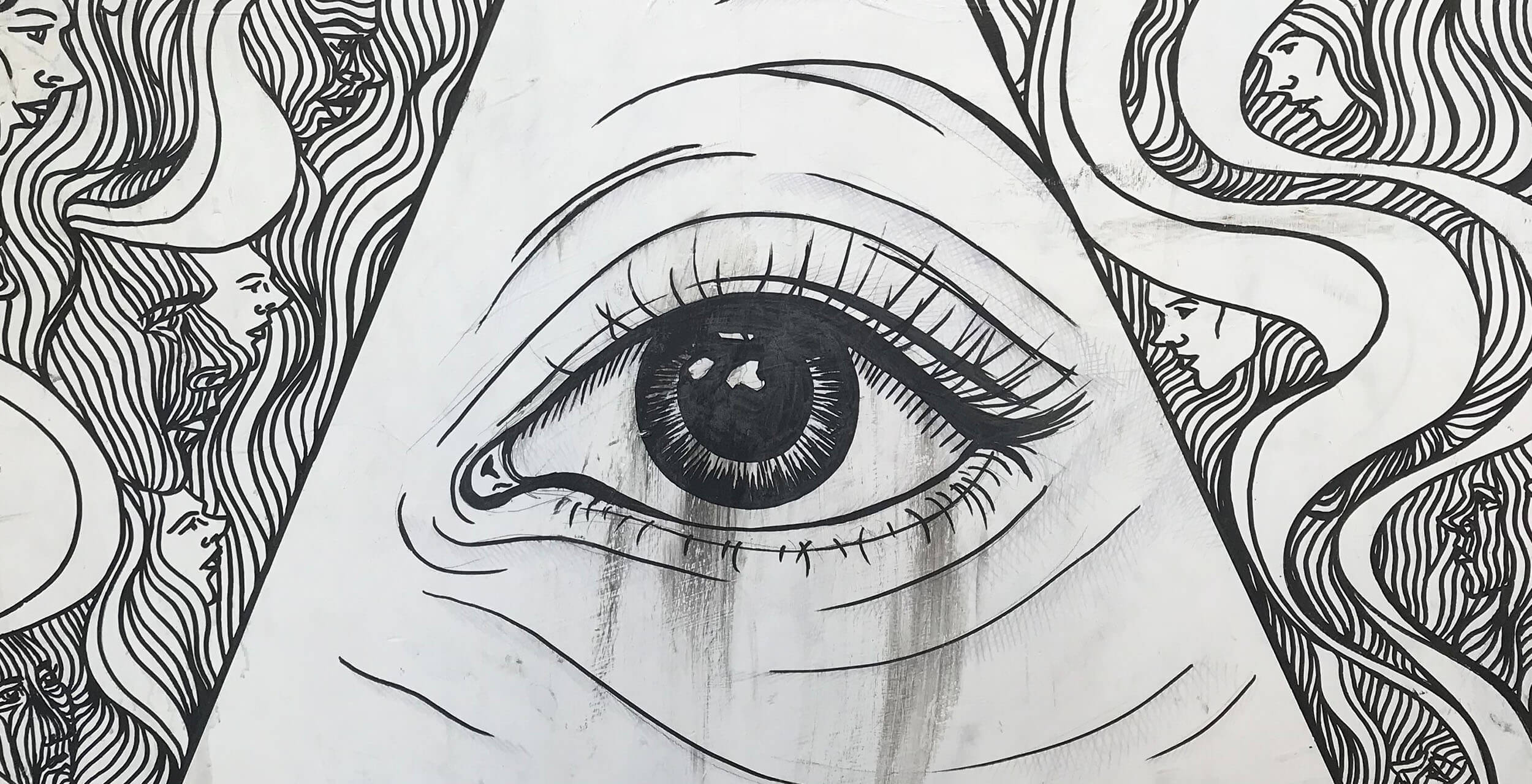 A close-up of two sketched faces, one bald and staring at something to the left with large, piercing eyes and another in the foreground with its mouth open, wailing, and its eyes closed